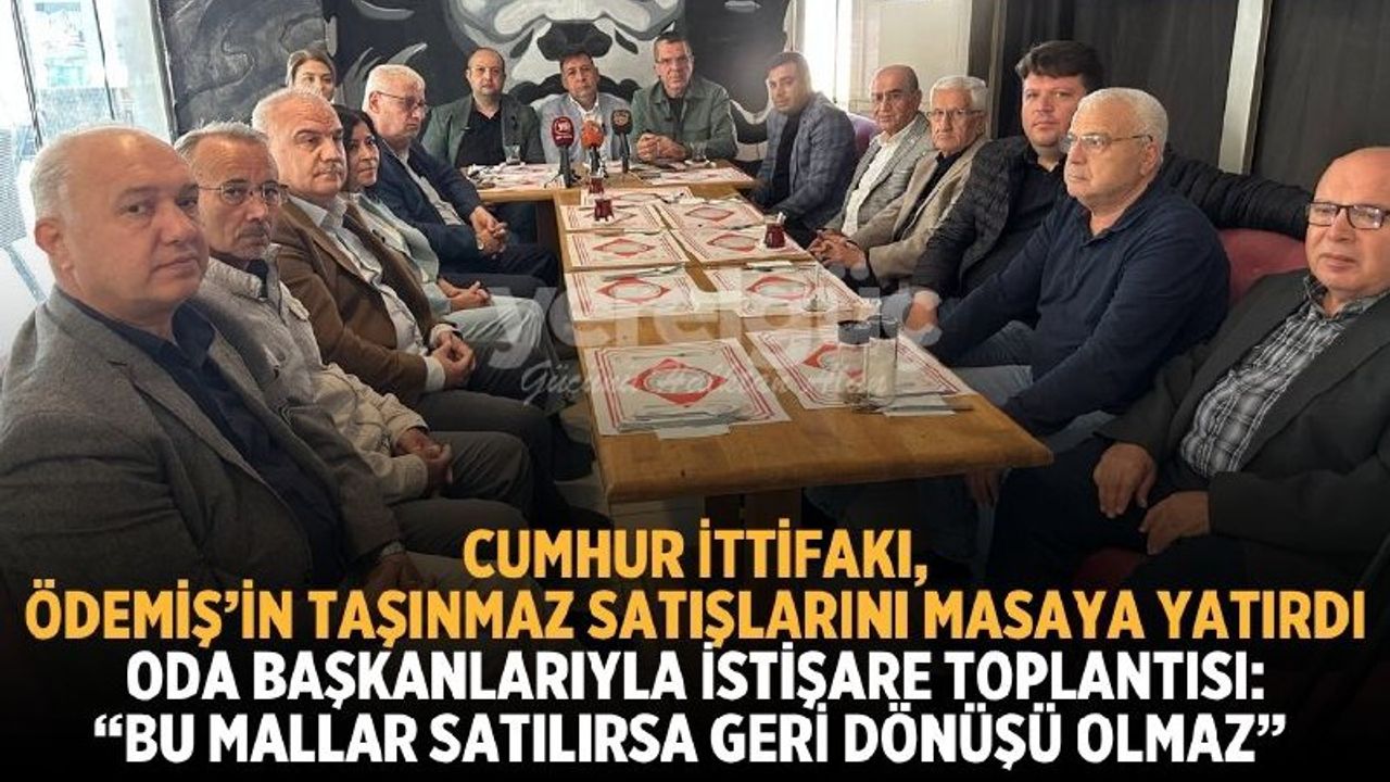 Cumhur İttifakı temsilcileri, Ödemiş Belediyesi’nin gündeminde olan taşınmaz satışları konusunu değerlendirmek üzere ilçedeki oda başkanlarıyla bir araya geldi. MHP, AK Parti ve BBP ilçe başkanlarının katıldığı toplantıda, belediyeye ait gelir getirici mülklerin satışı sert ifadelerle eleştirilirken, satışlara karşı hukuki sürecin başlatılacağı açıklandı.