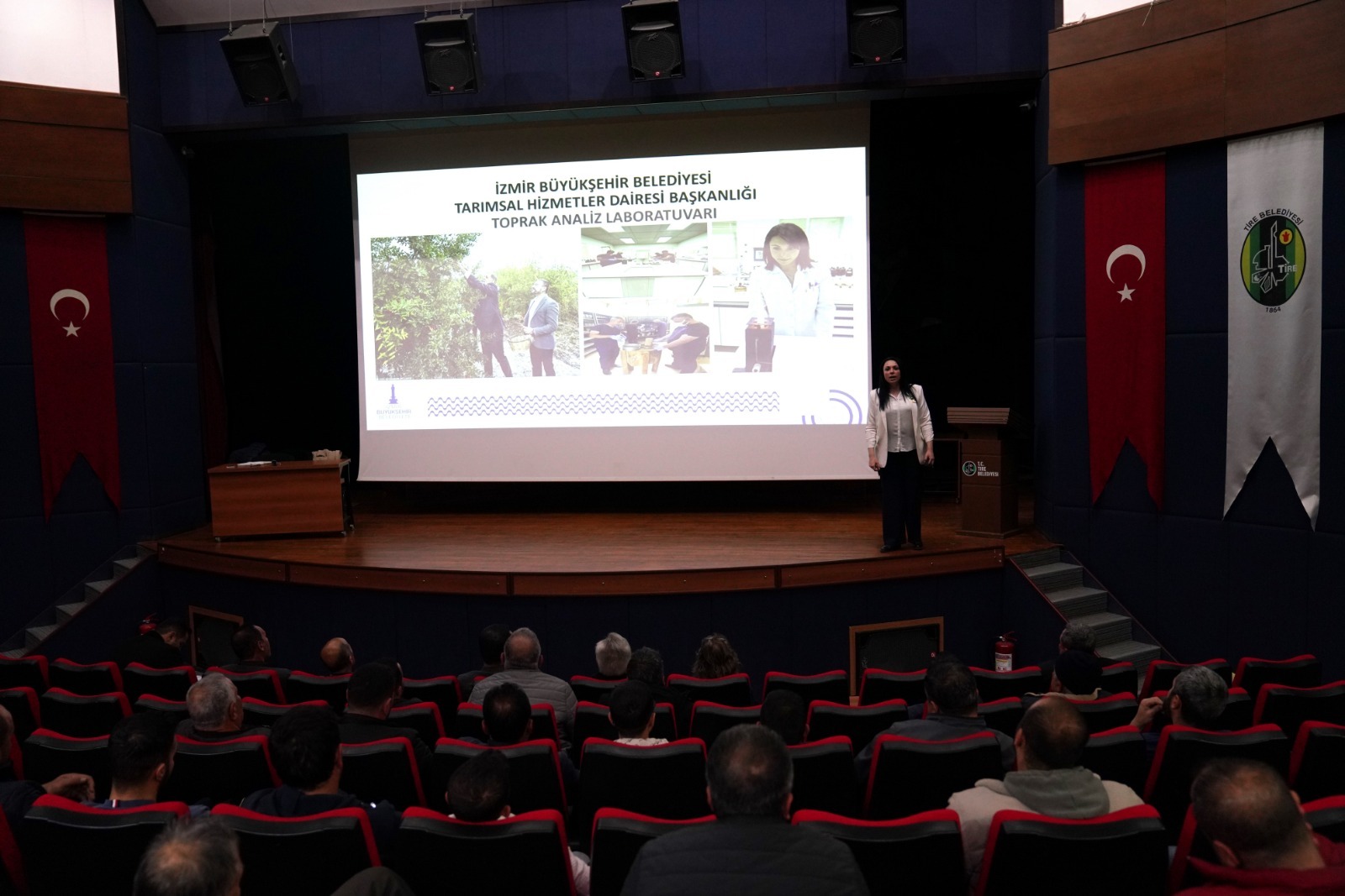Bu kapsamda Tire Belediyesi Kültür Salonu’nda düzenlenen eğitimde, İzmir Büyükşehir Belediyesi Toprak Analiz Laboratuvarı Sorumlu Mühendisi Dr. Ayşen Duman, üreticilere toprak analizi ve doğru tarım uygulamaları hakkında bilgi verdi.
