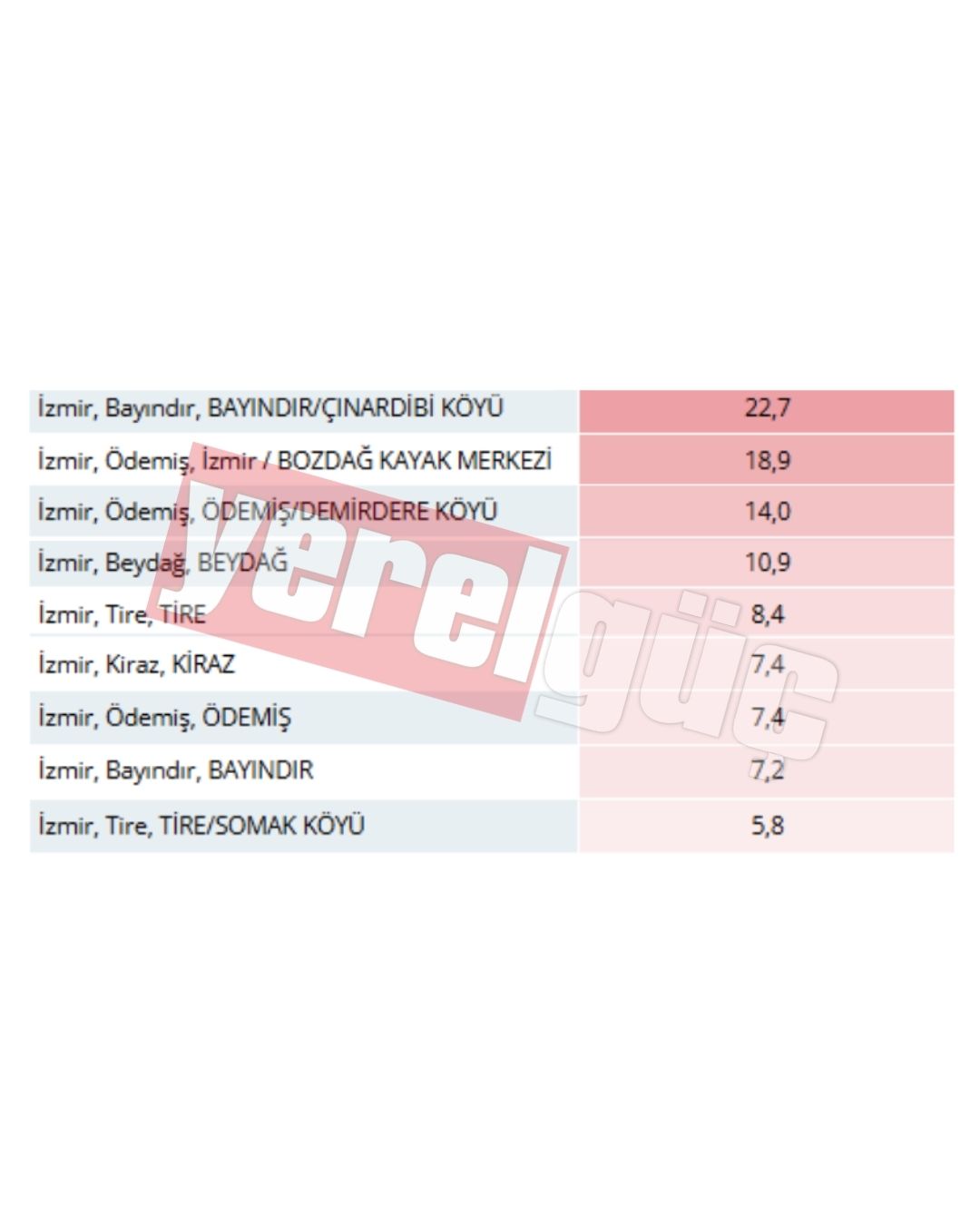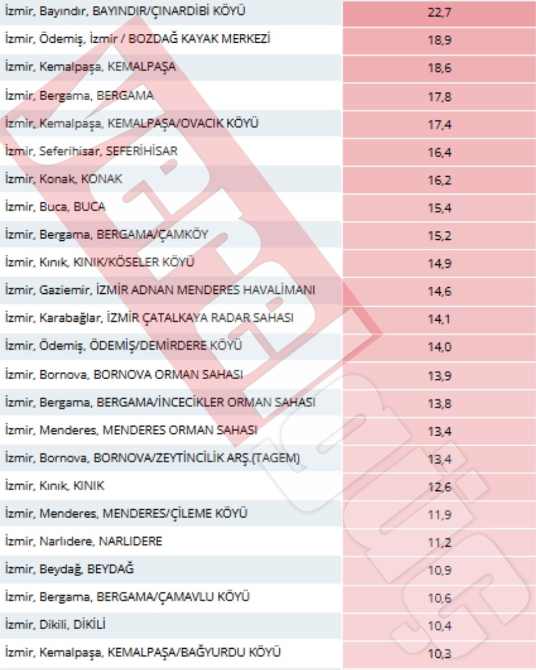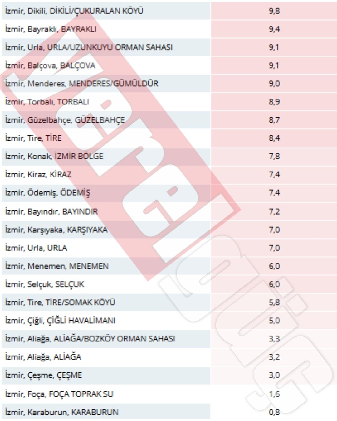 İzmir genelinde yağış sıralaması Bayındır, Ödemiş, Kemalpaşa, Bergama, Seferihisar, Konak, Buca, Kınık, Gaziemir, Karabağlar, Bornova, Menderes, Narlıdere, Beydağ, Dikili, Bayraklı, Urla, Balçova, Torbalı, Güzelbahçe, Tire, Kiraz, Karşıyaka, Selçuk, Çiğli, Aliağa, Çeşme, Foça ve Karaburun olarak belirlendi.