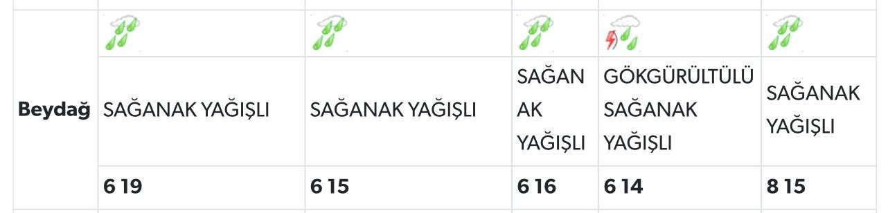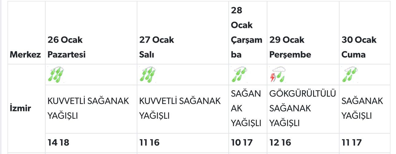 Meteoroloji verilerine göre İzmir merkez ve çevresinde pazartesi ve salı günleri 21–50 kilogram/metrekare aralığında kuvvetli sağanak ve gök gürültülü sağanak yağış bekleniyor. Çarşamba günü yağışlar sağanak şeklinde sürerken, perşembe günü gök gürültüsünün yeniden etkili olacağı, cuma günü ise yağışların hafifleyerek devam edeceği bildirildi. Kent genelinde sıcaklıkların gece 9–12 derece, gündüz ise 15–18 derece arasında seyretmesi bekleniyor.