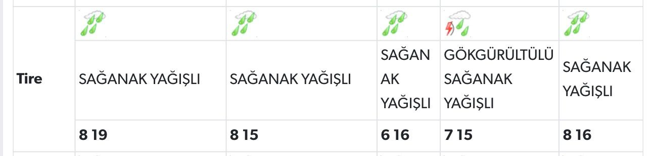 Ödemiş, Tire, Bayındır, Kemalpaşa, Kiraz ve Beydağ’da hafta boyunca aralıklı sağanak yağış görülecek. Perşembe günü gök gürültülü sağanakların etkili olması beklenirken, geceleri sıcaklıkların 6–9 dereceye kadar düşeceği tahmin ediliyor.