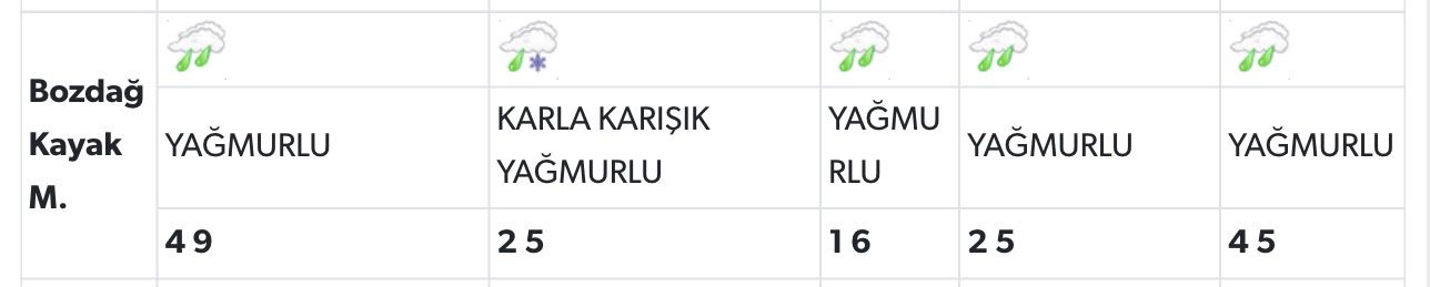 Bozdağ Kayak Merkezi’nde salı günü karla karışık yağmur bekleniyor. Bölgede hafta boyunca yağışlı hava etkisini sürdürürken, gündüz sıcaklıklarının 5–9 derece, gece sıcaklıklarının ise 1–4 derece seviyelerinde olacağı bildirildi.