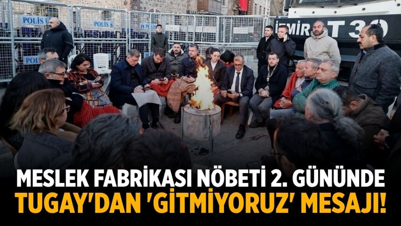 Tapunun, İzmir Büyükşehir Belediyesi’nden Vakıflar Genel Müdürlüğü’ne geçmesinin ardından polis eşliğinde tahliye işlemleri yapılan Meslek Fabrikası önünde Büyükşehir Belediye Başkanı Cemil Tugay’ın başlatmış olduğu nöbet ikinci günde de sürüyor.