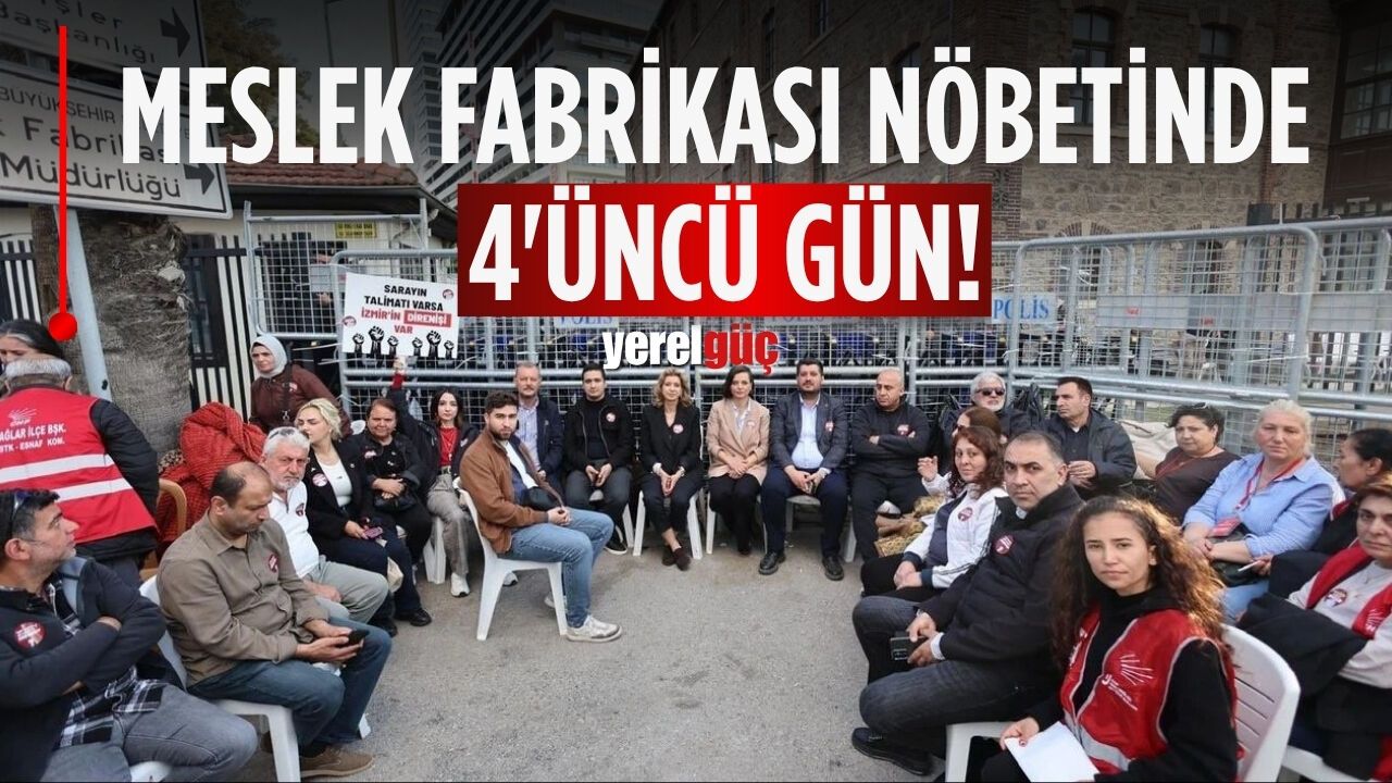 Tapunun İzmir Büyükşehir Belediyesi’nden Vakıflar Genel Müdürlüğü’ne devredilmesinin ardından polis eşliğinde tahliye edilen Meslek Fabrikası önünde, Büyükşehir Belediye Başkanı Cemil Tugay’ın başlattığı nöbet dördüncü gününde de sürüyor.