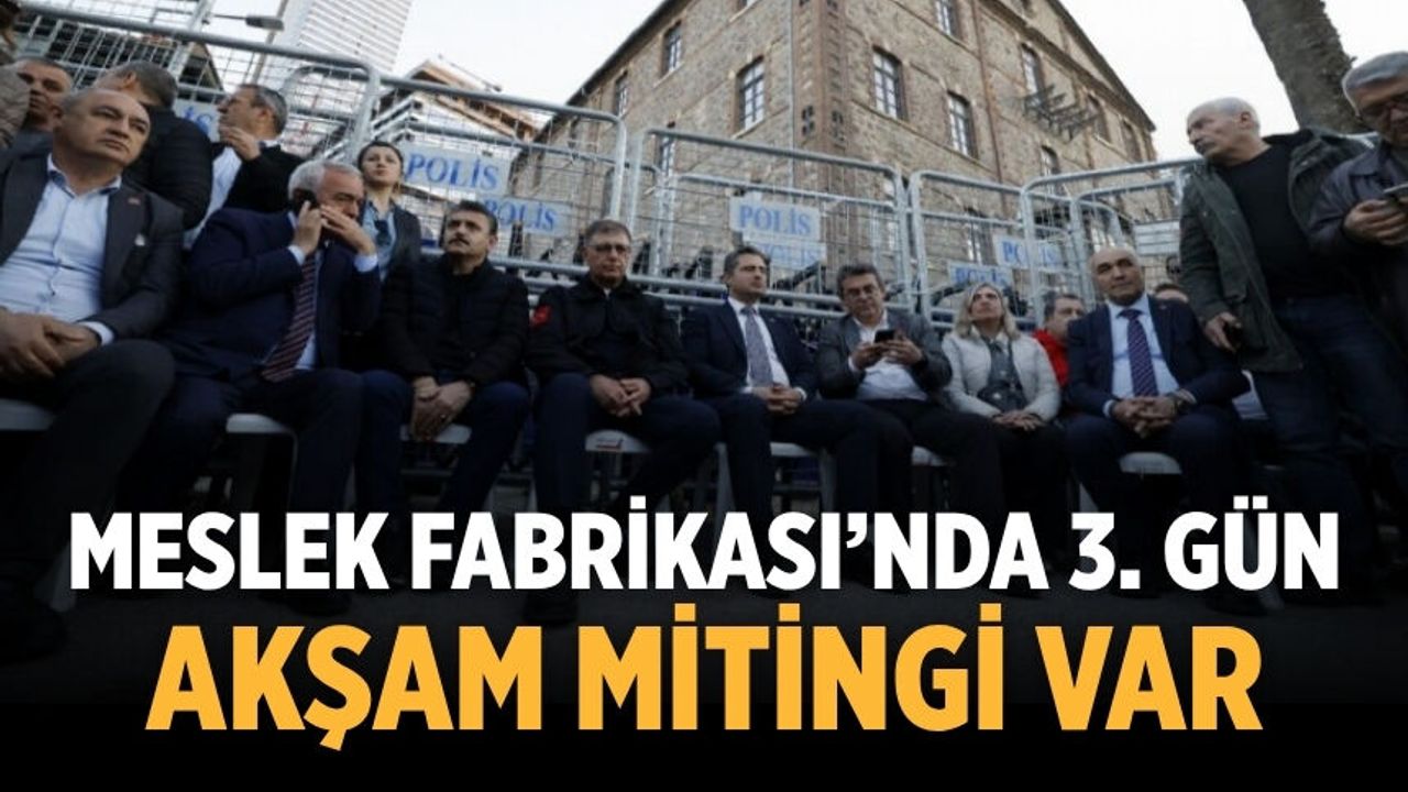 Tapunun, İzmir Büyükşehir Belediyesi’nden Vakıflar Genel Müdürlüğü’ne geçmesinin ardından polis eşliğinde tahliye işlemleri yapılan Meslek Fabrikası önünde Büyükşehir Belediye Başkanı Cemil Tugay’ın başlatmış olduğu nöbet üçüncü günde de sürüyor.
