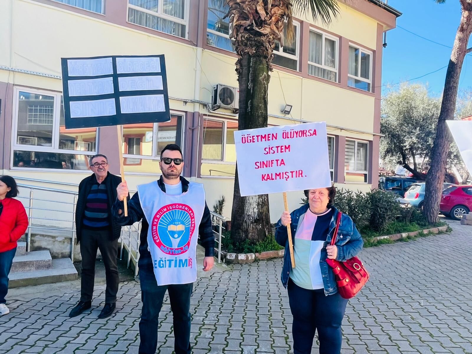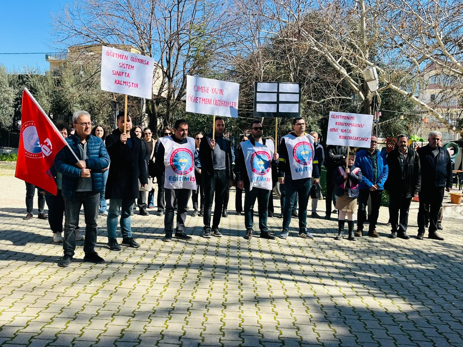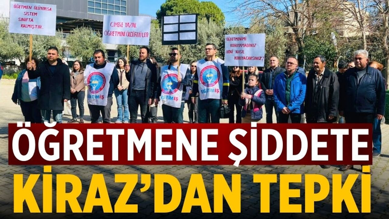 Kiraz İlçe Milli Eğitim Müdürlüğü binası önünde yapılan açıklamaya Kiraz Belediye Başkanı Nasuh Coşkun, CHP Kiraz İlçe Başkanı Mehmet Orhan ve yönetimi, önceki dönem CHP Kiraz İlçe Başkanı Yücel Çetinkaya, Atatürkçü Düşünce Derneği Kiraz Şubesi Başkanı Mustafa Duyar ile sendika üyeleri katıldı.