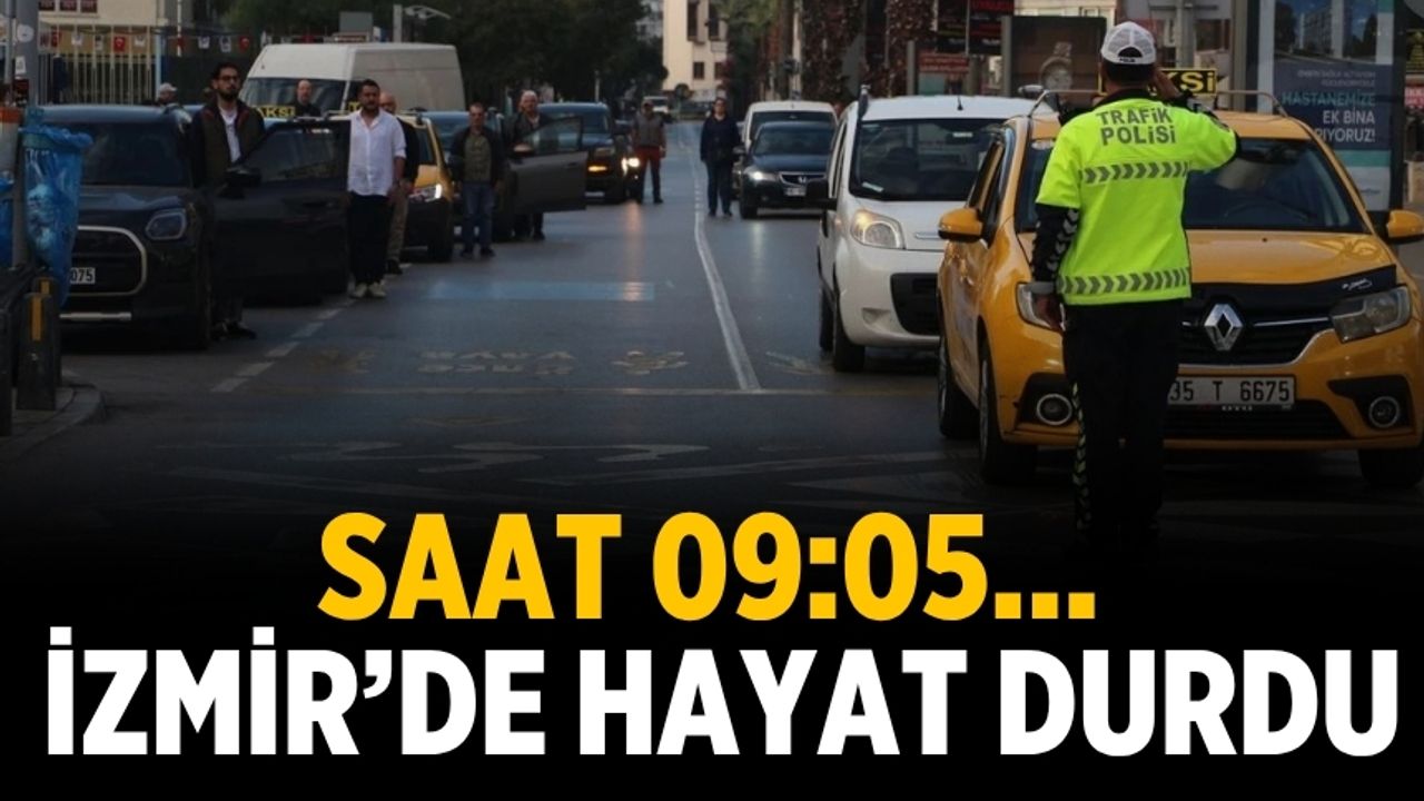Saatler 09.05'i gösterdiğinde yükselen siren sisleriyle birlikte sadece tören alanlarında bulunanlar değil, kentin her noktasındaki İzmirliler saygı duruşuna geçildi. Sürücüler de otomobillerini durdurarak Atatürk'e olan saygısını ve bağlılığını gösterdi.