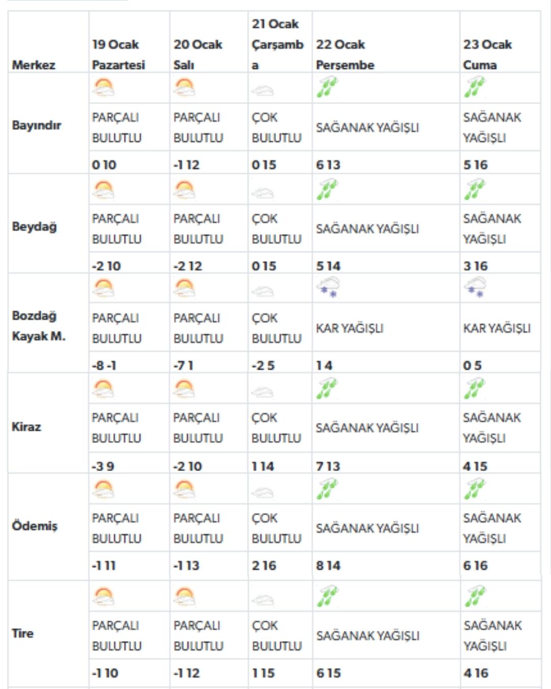 Merkez ilçeler Bornova, Konak, Karşıyaka, Bayraklı ve Karabağlar’da hava Pazartesi ve Salı parçalı bulutlu olacak. Çarşamba günü ise çok bulutlu bir hava hakim olacakken, Perşembe ve Cuma sağanak yağış hakim olacak. Kuzey ilçeler Aliağa, Menemen ve Bergama’da sıcaklıklar 5-14 derece aralığında. Güney ve iç kesimlerde yer alan Torbalı, Tire ve Selçuk’ta ise sıcaklıklar 9 ile 15 derece arasında değişecek.